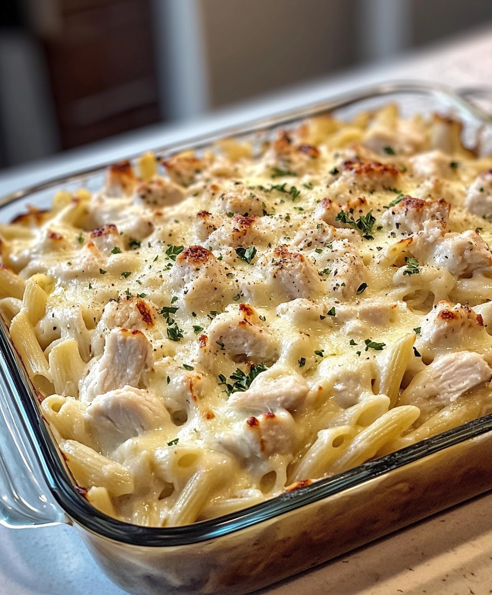 **🍗🧄 Zapiekanka z kurczakiem i sosem Alfredo Penne w kremowym sosie**