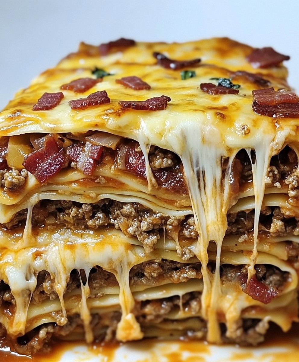 🍽️ Wszystkie wyraziste, wytrawne smaki cheeseburgera przełożone na kremową, czosnkową lasagne — to comfort food w najlepszym wydaniu z wędzonym bekonem!