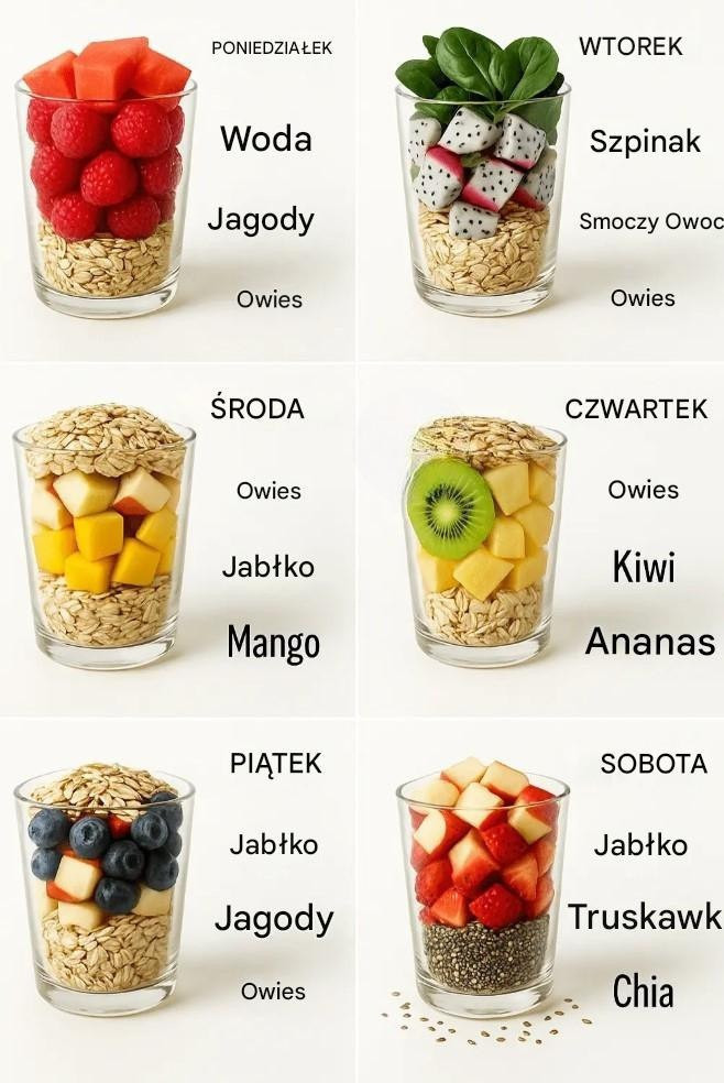 Kolorowe, pożywne śniadanie może rozjaśnić cały dzień. Oto prosty tygodniowy plan, który łączy owies ze świeżymi owocami , zieleniną i nasionami , aby zapewnić idealny początek każdego poranka. Poniżej znajdują się dokładne składniki na każdy dzień: