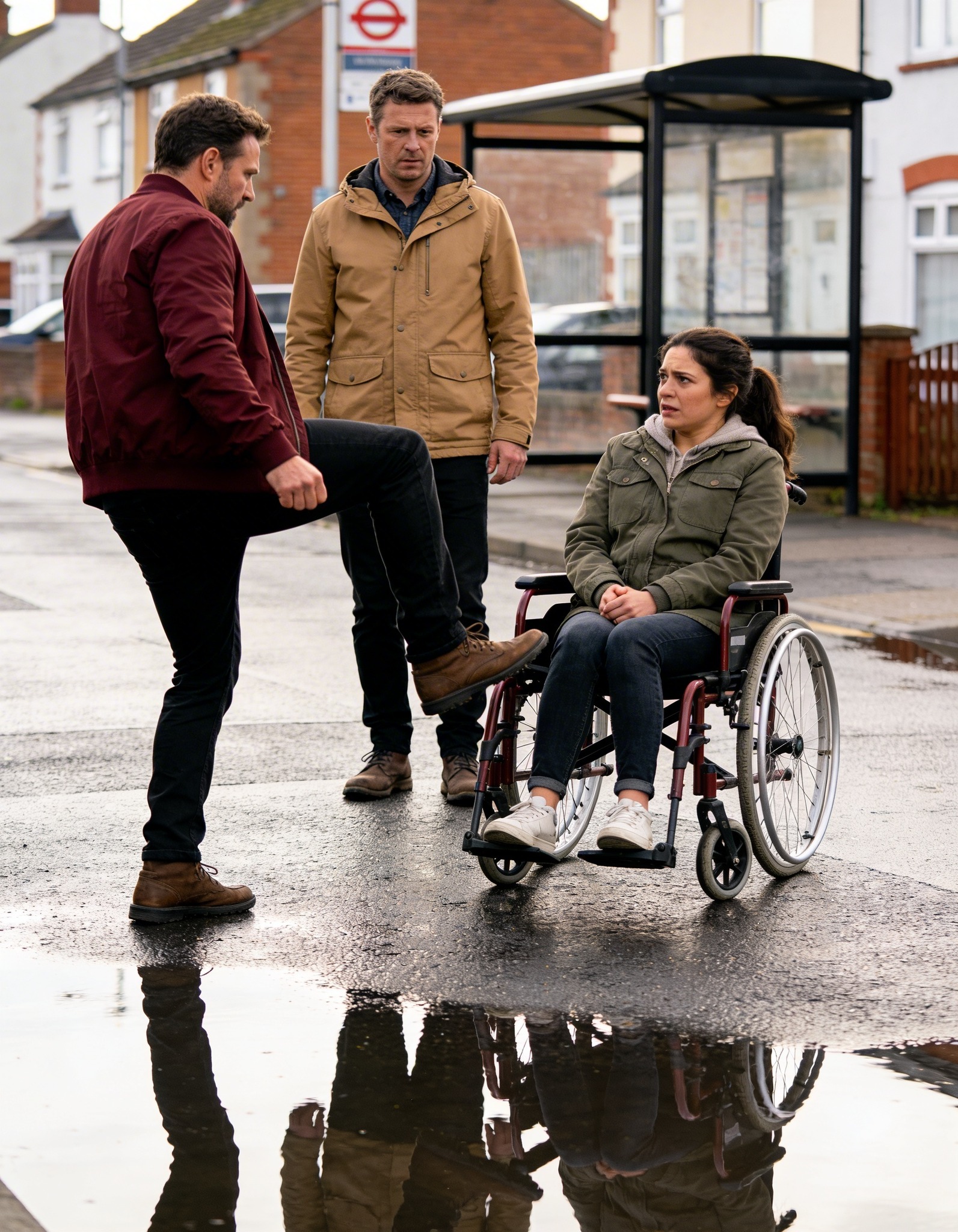 Elena, wciąż leżąca na ziemi, z trudem podnosiła kule. Kobieta w czerwonym płaszczu zebrała się na odwagę i podeszła pierwsza, wyciągając do niej rękę. Potem inny mężczyzna schylił się i podniósł jej torbę szkolną. Nagle cały wstyd ludzi na stacji przerodził się w gest solidarności.